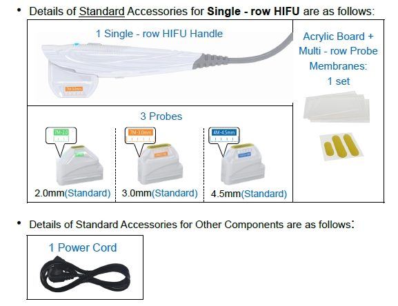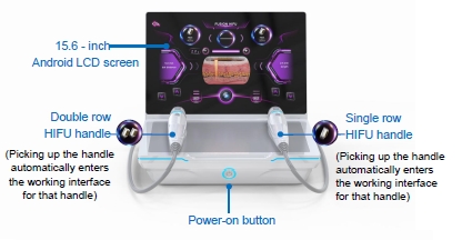 . Single - track Single - row High - intensity Focused Ultrasound System The second handle is equipped with a single - row HIFU probe, adopting single - track single - row fixed - point technology, accurately filling the technical blind area of double - row operation. Through the non - invasive probe, the ultrasonic energy is focused on a specific skin depth, forming nearly ten thousand coagulation points in the target tissue, activating the regeneration and reorganization of collagen through the thermal effect, and realizing deep tightening and contour lifting. The single - row and double - row probes are a perfect complement: the double - row probe quickly completes the basic lifting of the whole face, and the single - row probe performs refined operations on complex/sensitive areas such as the eye circumference and nasolabial folds, jointly constructing an all - round skin care system and adapting to personalized skin - beautifying needs.