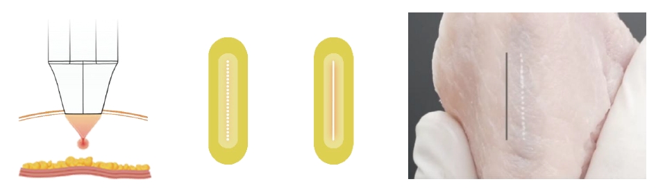 The dual - row HIFUinnovatively adopts the dual - track and dual - row (double - lines) simultaneous output dual -depth HIFUtechnology.Relying on multiple sets of customized dual - depth probes, it can precisely focus ultrasonic energy on specific depth tissues such as the fat layer,SMAS fascia layer, dermis layer, and epidermis layer. It realizes the precise linkage of "dual -track simultaneous emission and deep - shallow same frequency" and achieves the efficient synergistic treatment effect of multi - level targeting. In facial anti - aging, its probe can simultaneously act on different tissue layers of 4.5mm and 3.0mm, achieving layered and coordinated treatment. Among them, the 4.5mm depth is precisely positioned at the subcutaneous fascia layer. The fascia tissue at the energy - focused area will undergo a protein coagulation reaction.Taking this coagulation point as the center, a continuous pulling force is formed around it, driving the fascia layer and the attached muscles to produce a physiological traction effect, thereby realizing the lifting and tightening of the contour; the 3.0mm depth acts on the subcutaneous dermis layer. By means of energy, it activates the regeneration and reorganization of collagen. The newly generated collagen can gradually achieve the tightening and lifting of the skin from the deep layer and restore skin elasticity. A single operation can achieve the comprehensive lifting of the whole face and promote the upward lifting and tightening of the overall contour. For body shaping needs, three sets of dual - depth combined body probes (6.0&8.0mm,10.0&13.0mm,16.0&18.0mm) are also equipped. At the same time point, double - lines output different - depth energy in parallel, focusing on the multi - layer structure of subcutaneous fat and the deep fascia.When the energy acts on each tissue layer, a 60℃ - 80℃ thermal effect is generated. It can not only quickly shatter and dissolve large - granule fat cells(reducing the number of fat cells) but also synchronously stimulate the immediate contraction of deep fascia tissue and fibrous tissue; the shattered fat cells will be naturally excreted with the human body's metabolism, finally achieving a multi - level lipolysis and shaping effect of "slim without wrinkles". Schematic diagram:One- shot simultaneously emits two beams of ultrasonic energy to act on different depths